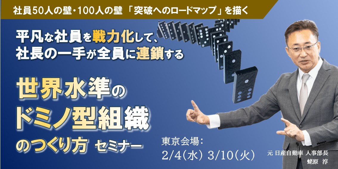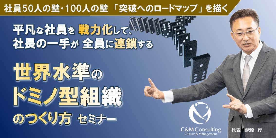 本セミナーでは、今いる平凡な社員たちを、経営者が思い描く方向に戦力化して、ビジネスを飛躍的に成長させる仕組み、「世界水準のドミノ組織*」の描き方と具体的な構築方法をお伝えします。
