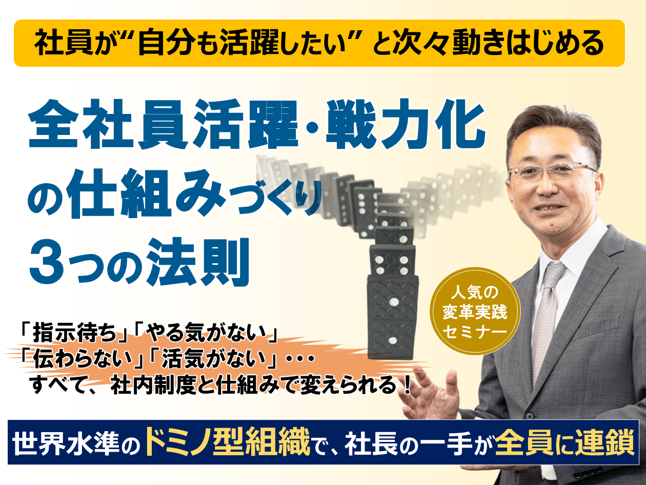 本セミナーでは、今いる平凡な社員たちを、経営者が思い描く方向に戦力化して、ビジネスを飛躍的に成長させる仕組み、「世界水準のドミノ組織*」の描き方と具体的な構築方法をお伝えします。